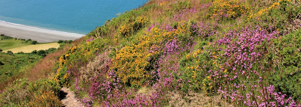 The way is steep and the path zigzags. My boots slip on stones and I am glad of my poles. After a while, the path becomes narrow and so overgrown with heather and gorse that I decide I must be following a sheep track. I hope when I get to the crest of the slope I will be able to see the SWCP and head for it.