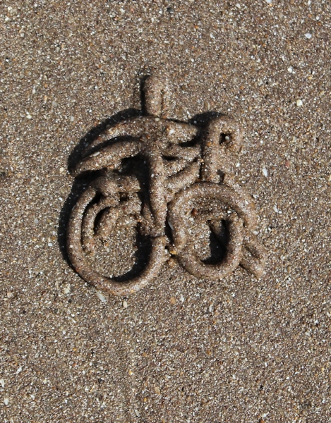 However, I am fascinated by the vast expanse of lugworm casts. And get carried away taking photographs. Each pile of casts is unique and it isn’t long before my eyes are converting random squiggles into recognisable patterns. Here, from left to right, is reluctant donkey, a crucifix above an altar (you need to squint to see that one) and a bicycle.