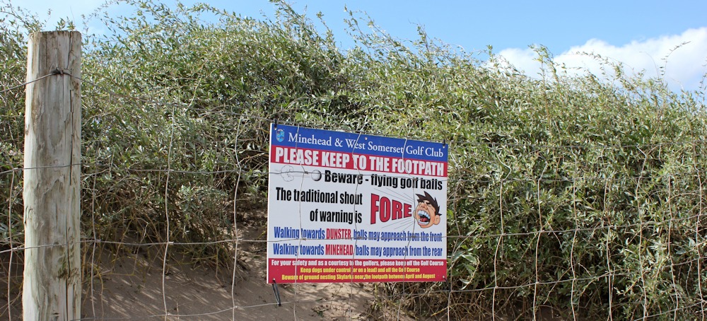 The path follows the edge of a golf course. The warning signs are predictable – it’s always the walker’s responsibility to dodge flying balls – but at least they are bright and amusing. There are several people playing golf today. I don’t hear anyone shouting ‘fore’.