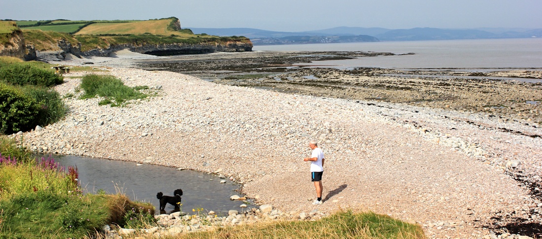 Today I am walking from Kilve to Stert Point, via the Hinkley Point nuclear power station. It is a hazy morning, with intermittent sunshine. I take a photo of a dog walker on Kilve beach, while looking back at the way I came yesterday. The white peaks of Minehead’s Butlins are just visible on the far shore.