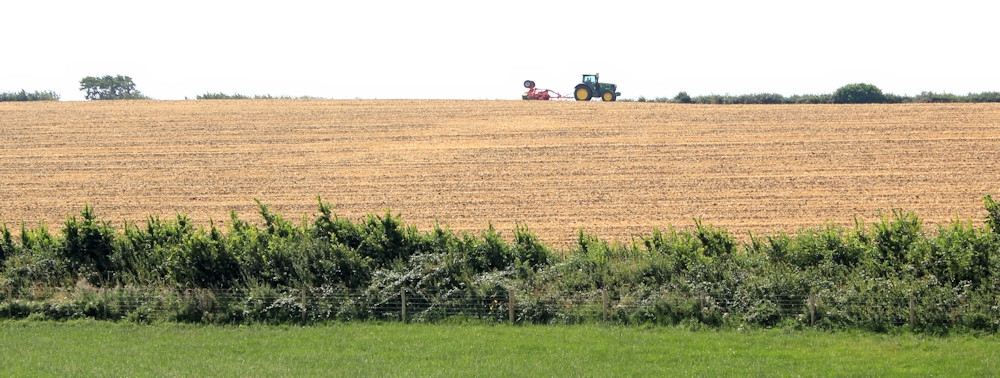 In the end, I retrace my steps and find the path that leads across the top of the cliffs. It is very overgrown in places. Hard going. Perhaps I made the wrong choice? Frustratingly, high hedges obscure the sea view and cut off the breeze. It is hot work. But I can watch the farmer on his tractor.