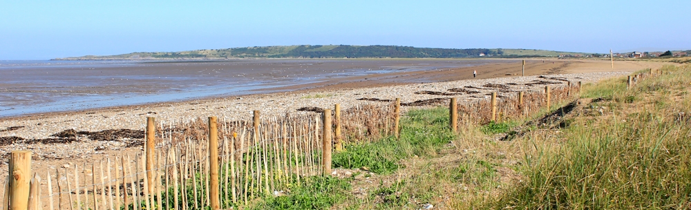 A low dune system gives way to a sandy beach, with a wide, muddy, intertidal area below. Wales is visible in the distance. I see the usual warning notices. Sinking mud. DANGER!
