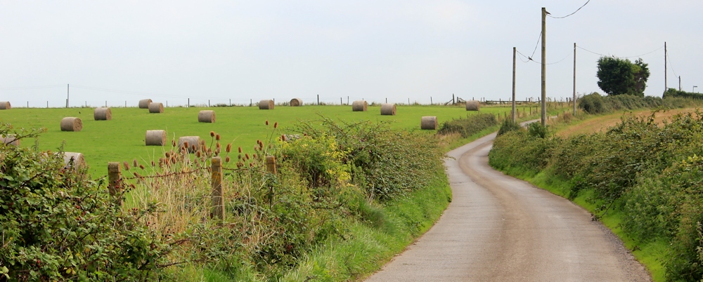 I follow the narrow track from Woodspring Priory to the nearest proper road. I am surrounded by farmland and the main crop seems to be grass. Hay bales glow in the afternoon sunshine.