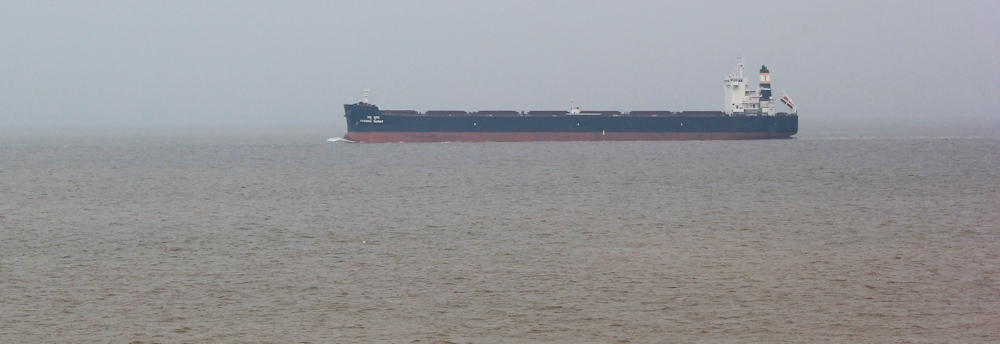 Out in the water I see a giant ship heading up the estuary. It looks rather like a roll-on-roll-off ferry – with a snub bow and a flat stern. But its sides are very deep with no portholes, and my map doesn’t show any passenger ferry routes along the shore. So it must be a cargo ship. But no sign of containers on the deck. A mystery.