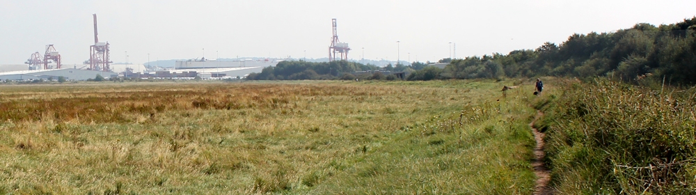 I leave Portishead Marina behind me and am pleased to find a footpath (unmarked on my map) that runs alongside the edge of the marshy shoreline. In the distance are the cranes of Portbury Docks.