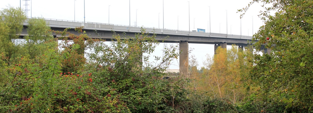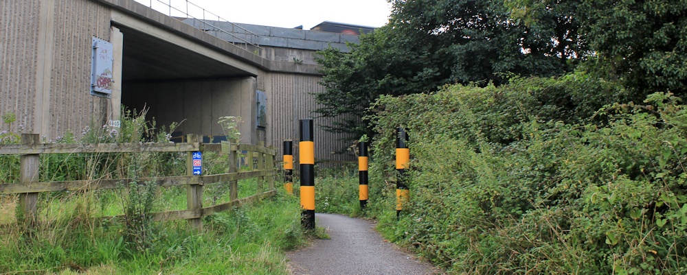 The roar of traffic grows louder as I approach the M5 river crossing. Striped posts mark where the path dives under the road.