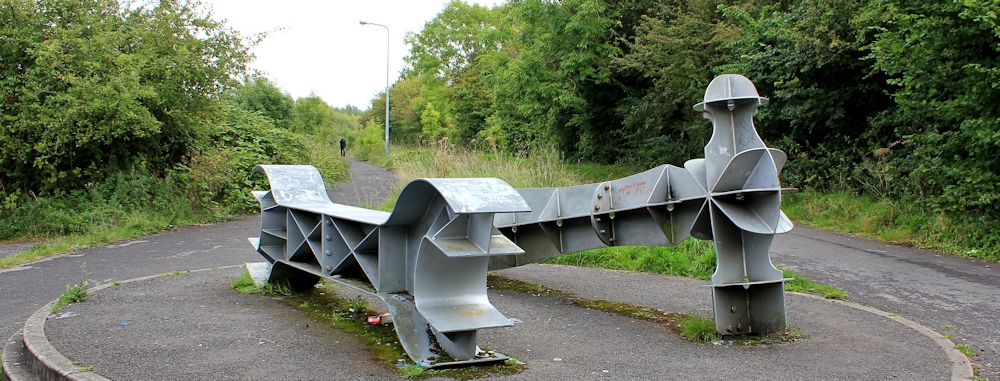 Further on and the cycle track widens. There are two lanes, one for cyclists and one for walkers. It’s almost a motorway! I pass a piece of industrial-themed sculpture.
