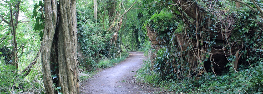 The cycle way runs through a tunnel and alongside a disused railway line for a few yards. I am surprised to see the rail tracks are still in place. They disappear off into woodland, overgrown with weeds and brambles. It looks like a scene from an apocalypse movie.