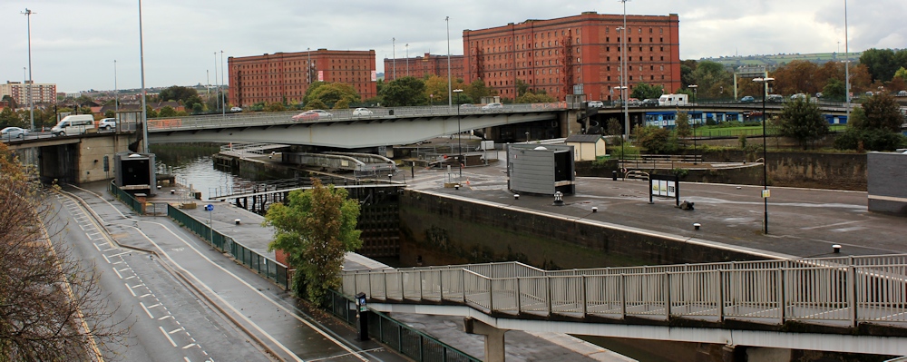 I’m down by the river. But there is no footpath heading in the direction I want to go. So I end up walking 1/2 a mile the wrong way – up the river – before I can find a safe place to cross. A footbridge takes me over the road and to the edge of a canal lock.