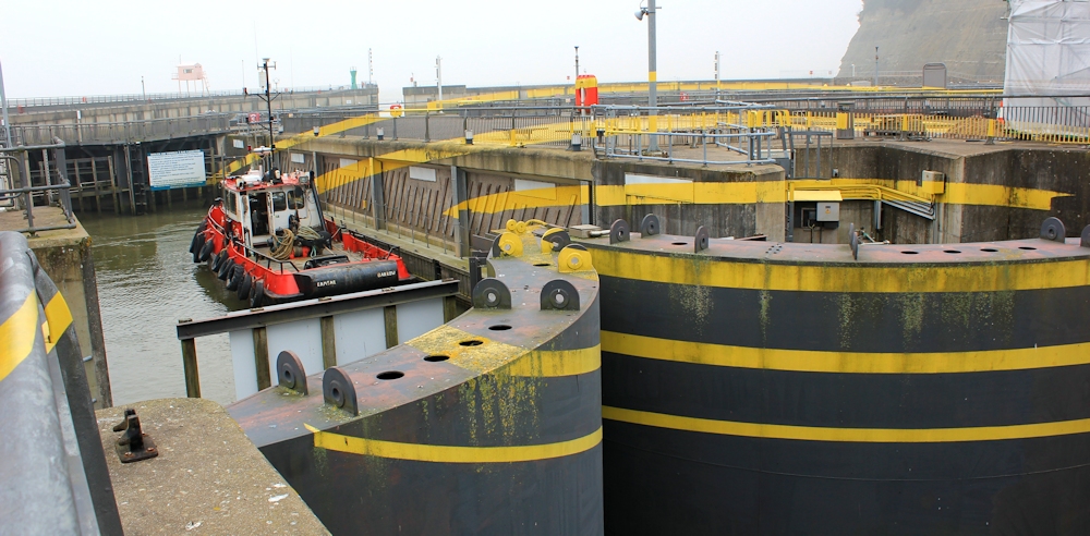 At the far end of the barrage, I reach the locks that mark the entrance to the bay. A red tug is passing through and I stop to watch the dock gates in motion. I notice the yellow stripes that are painted across the structures of the lock. They form a series of concentric circles.