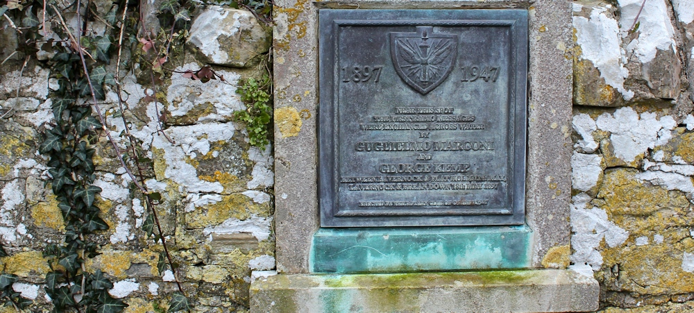 In the wall, beside a tiny church, I find a bronze plaque commemorating the first Marconi radio messages to be exchanged across water: between Lavernock Point and Flat Holm island in the Severn Estuary, and then between Lavernock Point and Brean Down in Somerset.