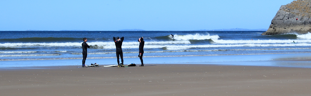 And three surfers arrive. They get going with some warm-up exercises before heading into the waves, where a single surfer is already riding his board.