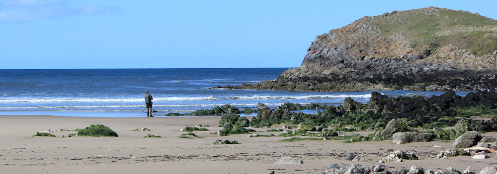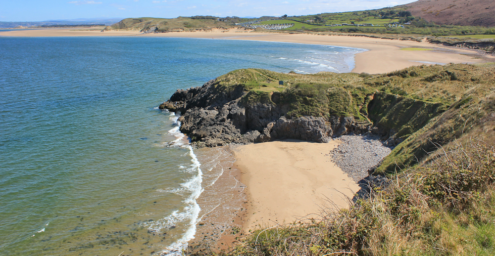 A pretty little bay lies at the end of the dune system. The bay is bounded by Foxhole Point at one end (where I’m standing) and Twlc Point at the end (the nearest promontory in the photo below)
