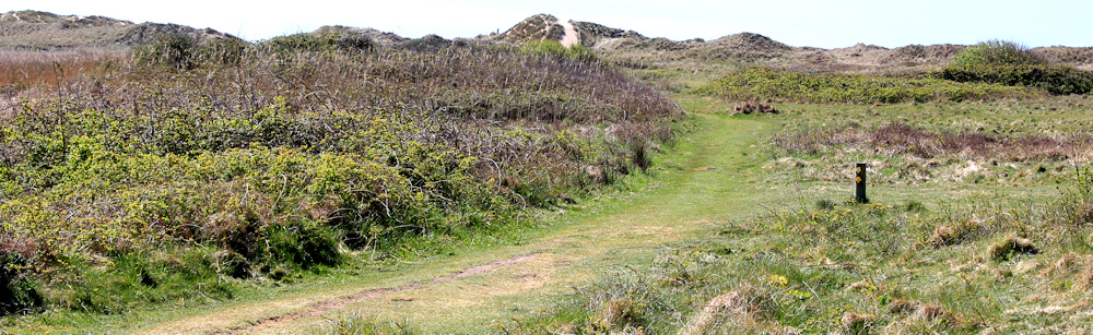 I’m going to walk back to my car following an inland route across the dune system. First I have to negotiate a static caravan holiday park and pick up the footpath on the far side. From here the route crosses the edge of fields and winds among some vegetated dunes. In places it is well-marked, but in others I need to refer to my Garmin.