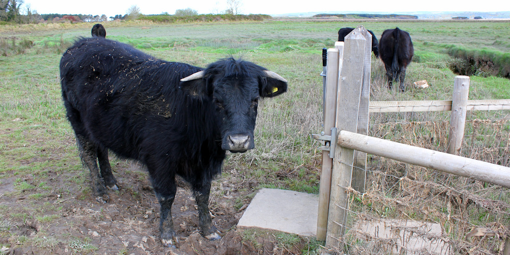 I haven’t gone far when I come across another obstruction. This one has four legs. I really do need to get through that gate, but this cow – with sharp horns – refuses to move.