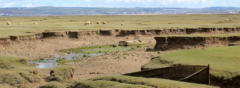 12 sheep and wrecks, Llanrhidian Marsh, Ruth walking in Gower