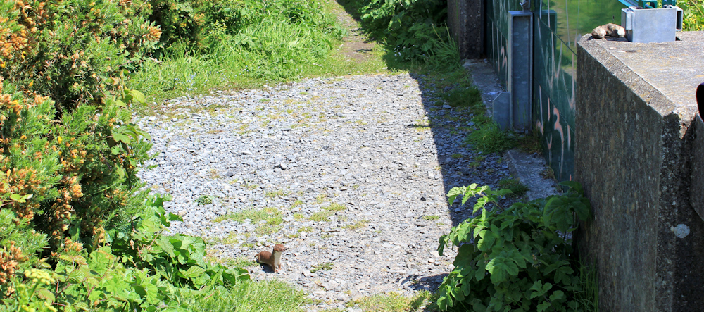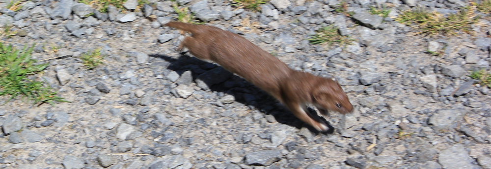 Movement on the ground. I look down. And catch sight of a streak of brown. It’s a weasel or a stoat – I don’t know the difference. And it’s darting around like a maniac.