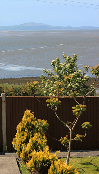 Standing at the far end, I look over the gardens of houses beneath, over the estuary, and a clear view of Llanmadoc Hill.