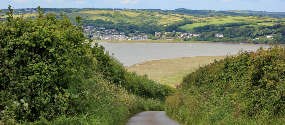 The lane seems to be heading straight down to the shore of the River Taf. Over the water is Laugharne, with the grey ruins of another castle.