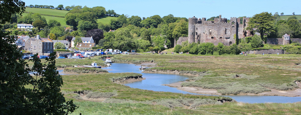 After lunch I walk along the Wales Coast Path as it follows the shore around the little bay and then along the wooded slope of Sir John’s Hill. Up on higher ground I stop to take a photograph of Laugharne’s meandering river and its castle walls.