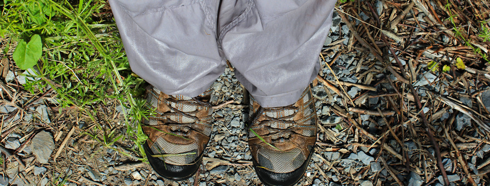 I’m hot in the sun. Some fallen tree trunks provide a handy spot for a rest, a drink and a chance to apply more sunblock to my face and arms. My feet are still soaking from the dewy grass earlier this morning and, while my soggy socks steam gently in the sunshine, I try to mop up excess moisture from the inside of my boots with a scrunched up tissue.