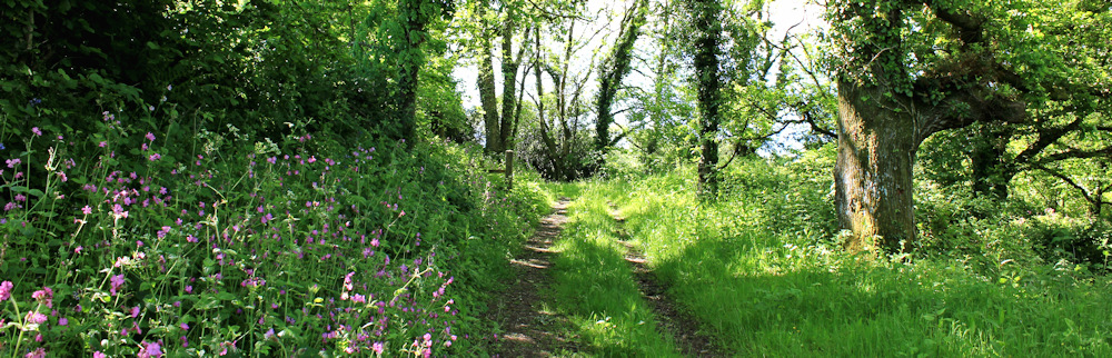 Soon my path turns away from the road dips down to run closer to the river. I walk through flower meadows and then through woodland.