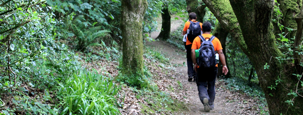 The path is delightful, weaving up and down through the trees. On a particularly steep section, I meet a group of walkers wearing orange charity tee shirts. They look hot and tired. Then I meet another group. And another group. These two men were puffing badly and were the last ones to pass me. I wonder how far they’ve walked?