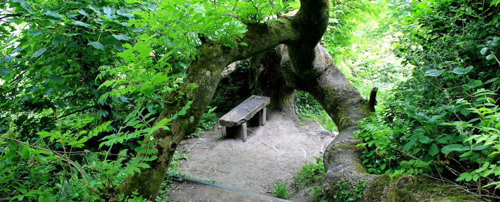 I walk down a steep hill and find an inviting bench, sheltering under the huge branch of an ancient tree. Time for another rest and a drink of water.