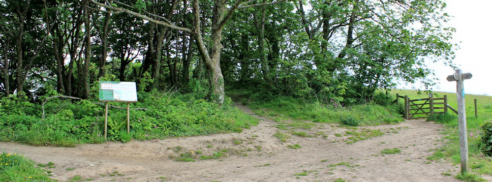 Back at the top of the hill, I try to figure out how I made the wrong turn. The path I took – the wrong path – is the wide one on the left of the photograph above. The right path is much narrower and straight ahead. The finger-post is ambiguous, pointing unhelpfully at a point between the two.