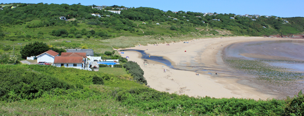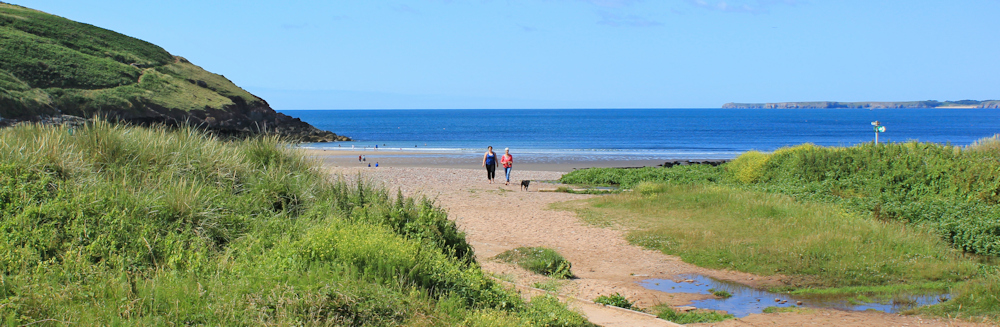 The village of Freshwater East clings to the slopes that surround the bay, but the beach has an isolated feel. This is because the houses are tucked behind the dunes or hidden within the surrounding trees and bushes.