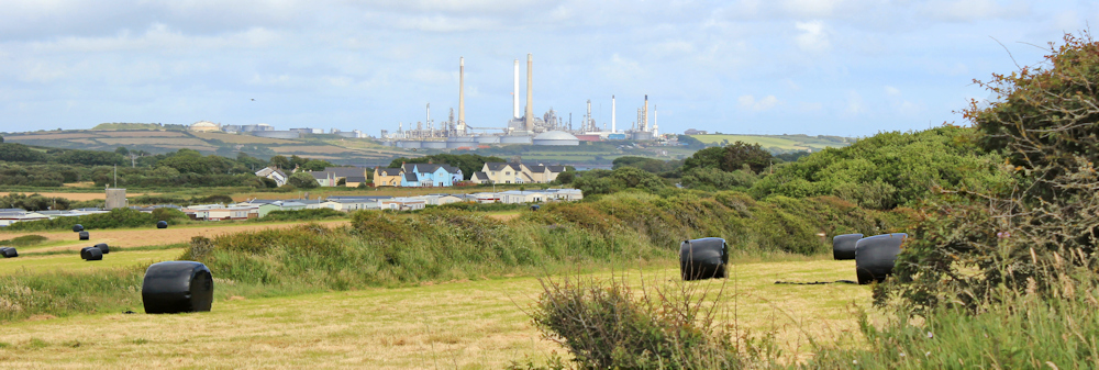 It’s a relief to get back on the road and away from the hazards of the path. Across fields I see a reminder that I am nearing Milford Haven – the tall chimneys of an oil refinery.