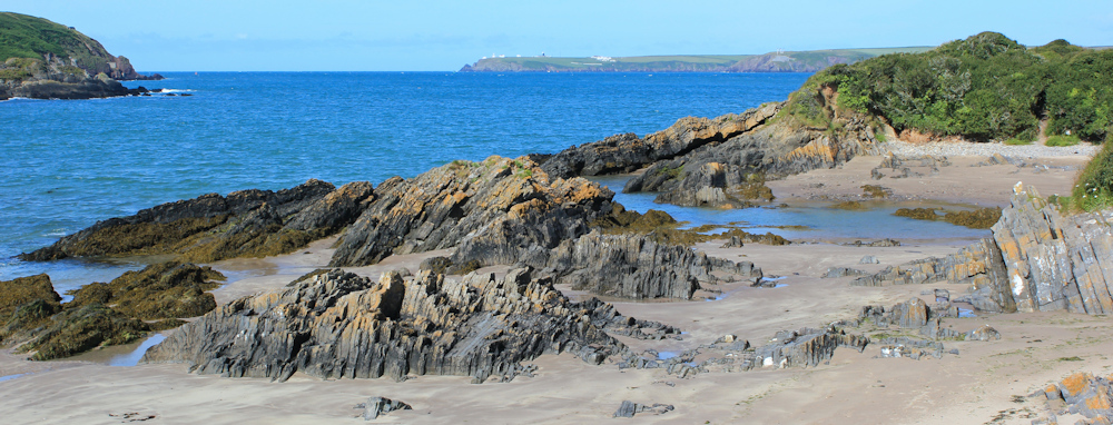 West Angle Bay is beautiful in the morning sunshine. To the side of the beach is a rocky area with a natural sea-water swimming pool. The backdrop is St Ann’s Head.
