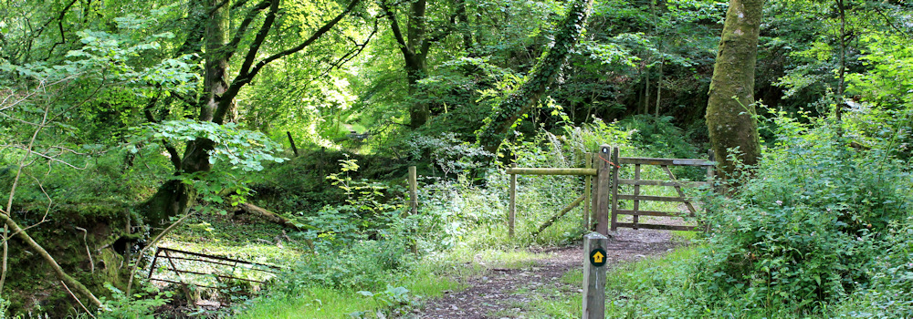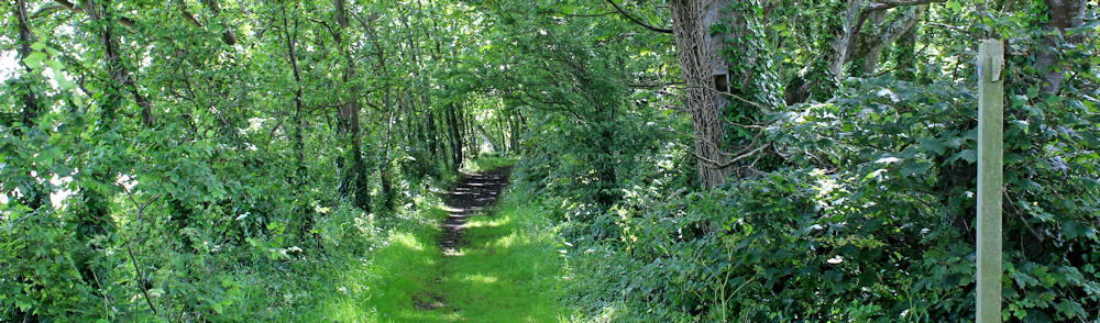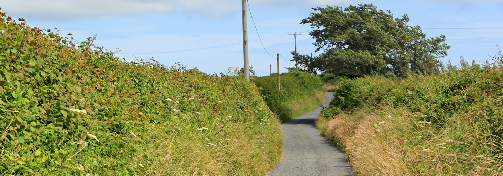 Struggling on, I reach the top of the hill, where the path turns off to the left and leads down a track towards a collection of houses. Brownslate, says my map. The track seems wider than the road. At the entrance, there is a hedge of tall bushes and an open gate. I sit, leaning against the gate, and rest in the shade of the bushes. The view is lovely, but there is no sign that I’m getting closer to Pembroke.