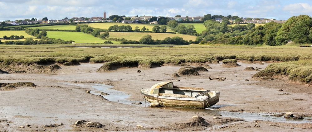 I join a road, with signs that warn of flooding, which takes me down to Quoits Pill. The tide is low and a sad-looking boat is marooned in the mud.