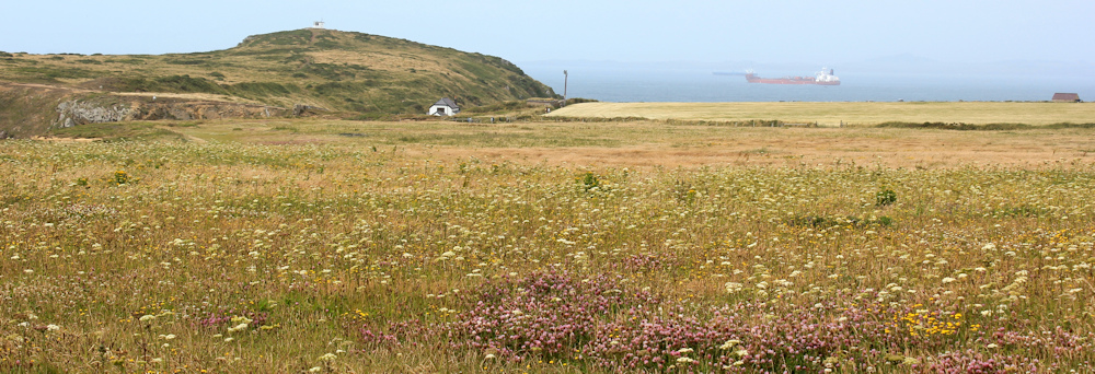 To my right there are flower meadows sloping downwards. And I can look right across and into the next bay, where a huge ship is anchored. Over in the misty distance is yet more coastline. St David’s? One day I’ll be walking there.