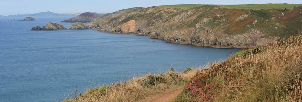I come to the brow of a slope which is dotted with brilliant-yellow ragwort flowers. The next headland is Pen Dinas (which means City Head) and the cluster of islands just off its tip have English names: Black Scar, Green Scar and The Mare. In the distance is the area around St Davids Head, and I can see Ramsey Island.