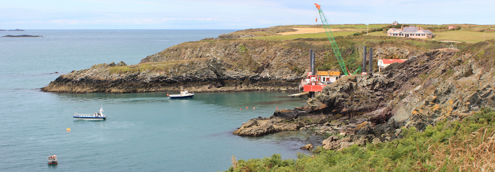 After a rocky scramble, the path winds around the edge of a broad bay. In the distance I can see the little harbour of Ynys Dinas, with the tall green strut of a crane sticking into the air. The crane seems out-of-place in such a quiet and scenic area. I wonder what they’re building?