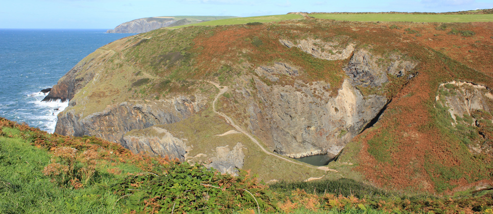 I come to a river valley, where the path plunges down to nearly sea level. A huge hole indents the opposite side of the valley. That must be the Witches’ Cauldron. It’s not marked as such on my map, but my B&B landlady told me about it.