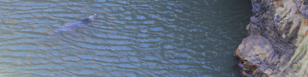 On the other side of the valley I stop to peer into the Witches’ Cauldron. Murky green water lies at the bottom. It’s connected to the sea and at high tides you might see some dramatic crashing waves. But at the moment it looks very peaceful. And there is a solitary seal floating just beneath the surface- as if in its own private swimming pool.