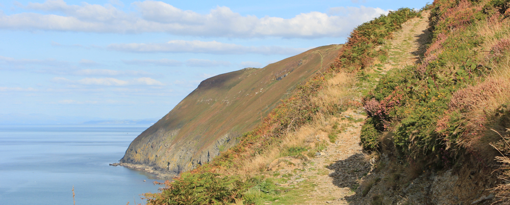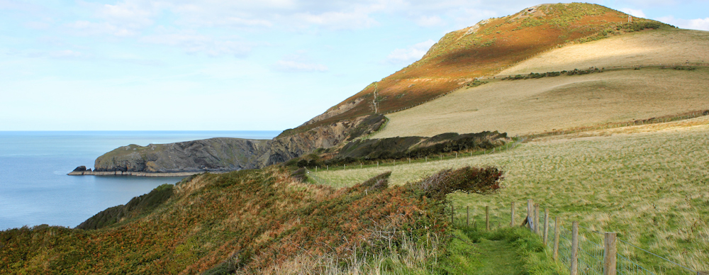 By the time I leave Llangrannog the blue sky is dotted with fluffy, white clouds. Ahead the tall peak of Pen-y-Badell seems to be on fire, as the sun suddenly catches the bracken on its slopes.