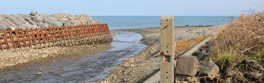 Aberarth has a beach and a small stream. The coastal path heads inland through the village, but I check my map and see a public footpath runs down the side of the stream to the shore, and so I follow this route. There is a high bank of sea defences protecting the mouth of the stream. Piled rocks. Riprap.