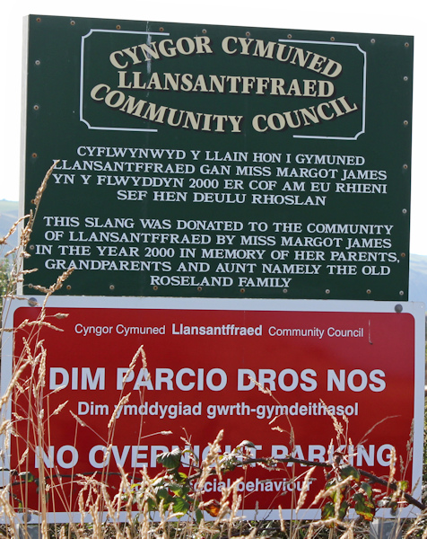 ‘This slang was donated to the community of Llansantffraed by Miss Margot James in the year 2000 in memory of her parents, grandparents and aunt namely the old Roseland family.’
