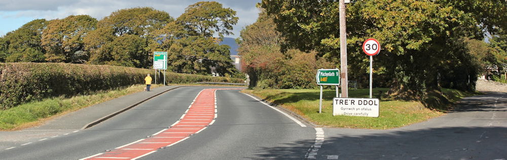 After a brief stop on a bench in Tre Taliesin, for a drink and a snack, I head down the main road – which luckily has a pavement – until I reach the next village, Tre’r-ddol.