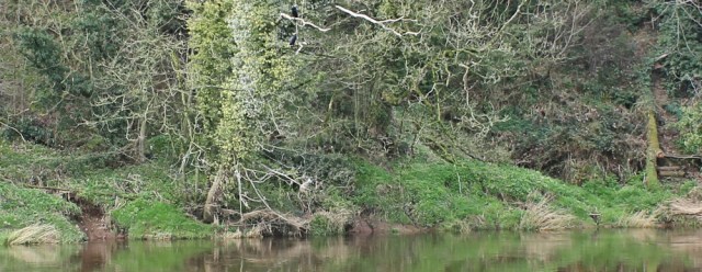 After crossing the bridge, a sign appears to suggest an inland diversion across a field, but the sign is so badly weathered (perhaps damaged by flood water) it’s impossible to read. In any case, the field looks far more boggy than the bank!