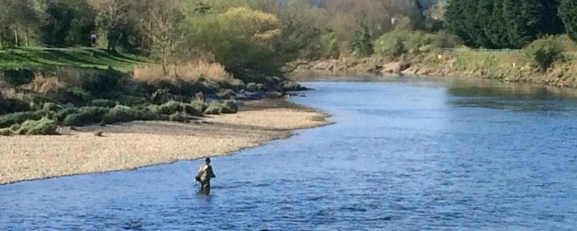 A fisherman is standing in the water. Fly fishing. I watch for a while, but don’t see him catch anything. Would it be salmon he was after? Or trout? (I know nothing about fishing!)