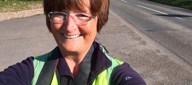 The traffic is not too heavy, but is moving quickly. Alan Palin warned me there would be a lot of road walking in Scotland, and advised me to buy a high vis jacket. It’s time to put it on. Can’t resist a selfie.