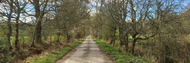 Well, that’s the answer to my question. Yes, I’m following a deer trail. Onwards, and I soon reach the end of the woodland. It’s been a pleasant, but tiring, section of the walk. Now I’m walking down a quiet lane.