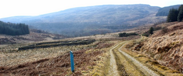 The path has joined a track, and I’m pleased to say I continue to make quick progress on a gentle downhill slope. I pass a 7 mile marker, and an old sheep pen. This is easy walking.