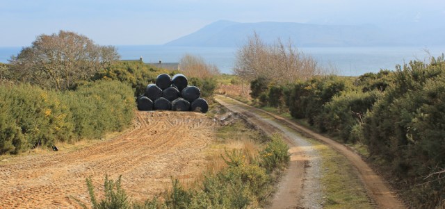 The landscape begins to change from woodland to arable. The track curves round and I get a sudden view of the sea – at last. And… that island over there must be Arran. Misty and mysterious. My old friend.
