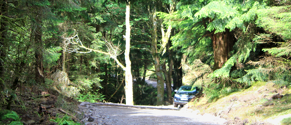 33 car on forest track, Ruth’s coast walk around Scotland